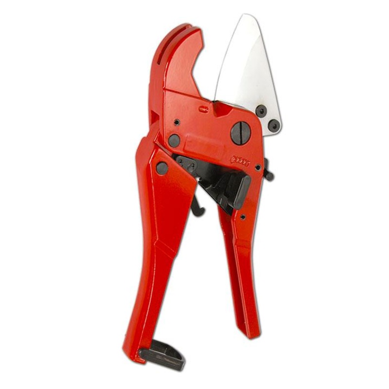 GOLDTOOL 42mm PVC Pipe Cutter. Cuts Pipes Made of Synthetic Resins Capacity: O.D 1 5/8" (42mm).PVC pipe cutter 42mm 1 5/8".Press the open button with thumb.Put the pipe diameter below 42mm in cutter, push down handle repeatedly,forthwith cut off.After cutt