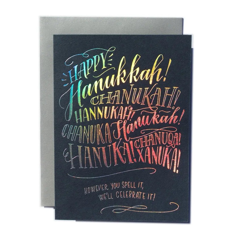 If Hanukkah is the Festival of Lights, this card is certainly a Festival of Glimmering Holographic Foil! Perfect for your friends and family who all seem to have their own opinions on how the holiday is spelled, despite the fact that they all celebrate it