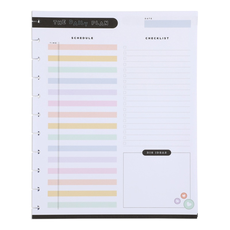 Stay on top of daily tasks, schedules, and BIG ideas with this Big size filler paper. It includes a space to write the date, add a schedule for the day, make checklists, and write down ideas. The back features a "Top Three" section for priorities and a dot