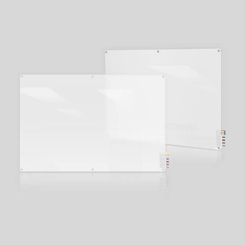 Tempered glass, 1/4″ thick, provides a non-porous surface that will not ghost or stain and works with standard dry erase markers.