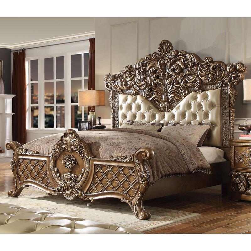 HD-8018 - Eastern King Bed - Antique Gold & Perfect BrownProduct FeaturesColor: Antique Gold & Perfect BrownMaterials: Wood / Resin / LeatherHD-8018 - Eastern King Bed - Antique Gold & Perfect Brown90.0"W x 100.0"D x 86.0"H - 575.0 lb