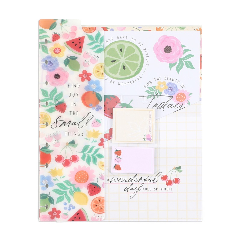 - Includes a storage folder with pockets for papers, sticker sheets, and more! The sticker sheet includes fruit and floral designs.