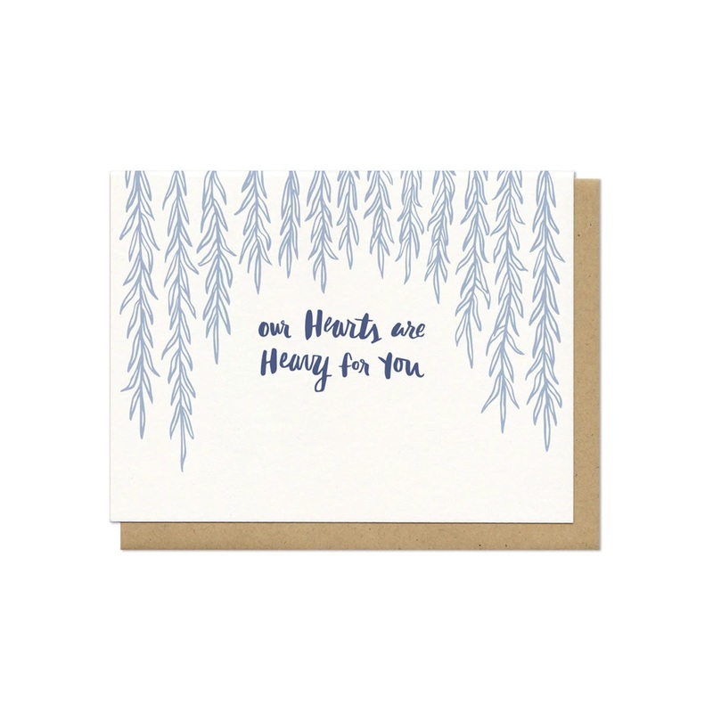 "Our hearts are heavy for you"Let a pal know you're here for them with simple weeping willows and a tender sentiment.Size: A2Blank inside100#, 100% recycled white paperA2 sized kraft paper envelope