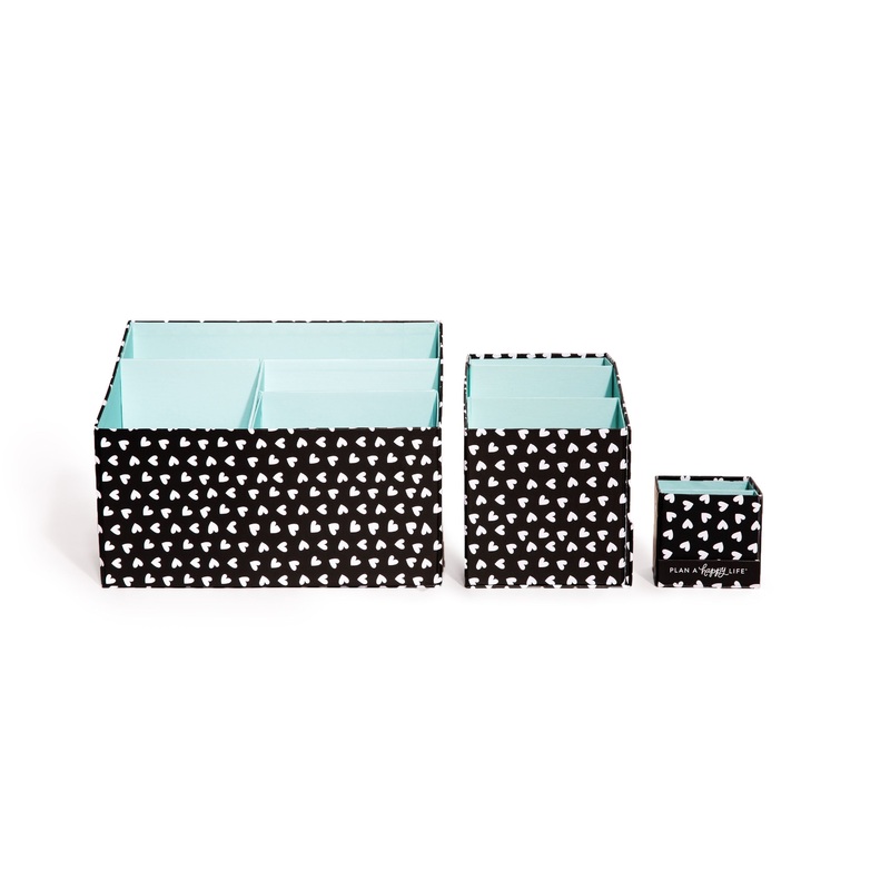 Keep your planners, stickers, and accessories together with this storage pack. Specifically designed to fit The Happy Planner and accessories. This multi piece set includes a sticker storage box, pen storage compartment, accessory storage box, and custom labels. Make it easy to store and access your collection. Allover heart polka dot print with The Happy Planner logo at the side.