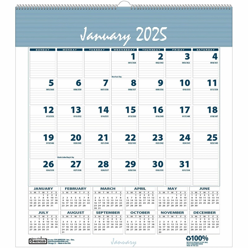 The Bar Harbor calendar with soothing wedgwood blue and gray colors complements any decor with a professional appeal. Dated planning pages range 12 months from January to December. One-page-per-month format includes ruled daily blocks (5/8″ x 3/4″), full-year reference calendar, Sunday-through-Saturday scheduling, count of days/days remaining and holidays. Strong wire binding firmly keeps the pages together in one place. Wire hanger lets you easily hang the calendar on the wall. Wall calendar is printed on FSC certified paper with soy inks and made with a high percentage of recycled material.