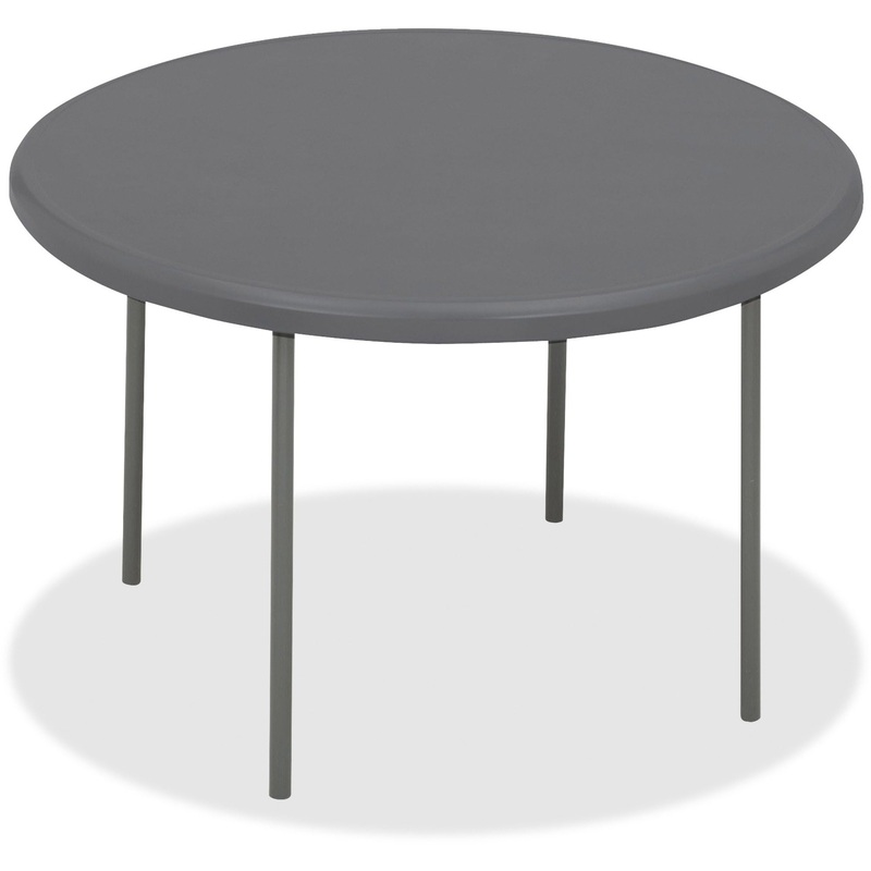 Round folding table is made for heavy-duty use indoors or outdoors yet is 30 percent lighter than standard folding tables. 2″ tabletop is made of durable, blow-molded, high-density polyethylene that is dent-resistant and scratch-resistant. Tubular legs are made of heavy-gauge steel with a powder-coat finish. Legs fold into recessed cavities beneath the table. Folding table is designed to nest with other Iceberg IndestrucTable TOO 1200 Series tables when stacking to allow maximum storage capacity.