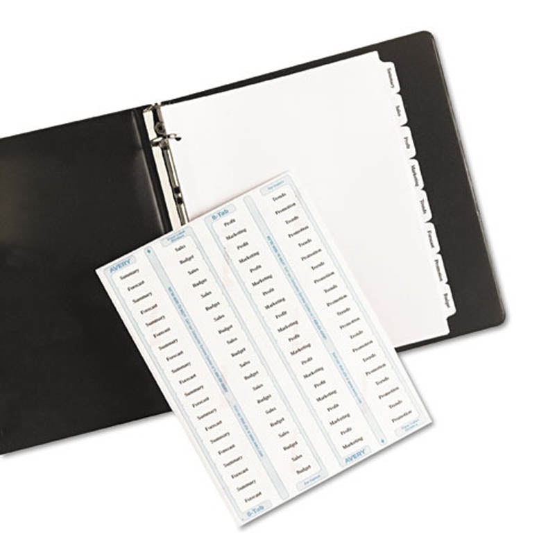 FeaturesCreate an index using a typewriter and office copier.Clear labels virtually disappear on white divider tabs.Save time by labeling all tabs at once using the patented Easy Apply label strip.Three-hole punched for use in standard ring binders.Details
