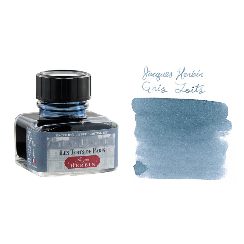 This 30ml glass bottle of Jacques Herbin Gris Toits grey fountain pen ink is elegantly labeled and has an integrated pen rest. Jacques Herbin ink is non-toxic and pH neutral, water based, flows smoothly, and uses all natural dyes.Welcome to Paris, the city