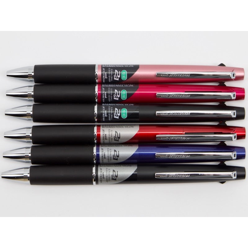 The Mitsubishi Jetstream is an oil-based ballpoint pen that writes as smoothly as a gel ink pen. The Jetstream 2 1 includes two colors of Jetstream ink (black and red) .5 mm pencil. The 2 1 is available in two sizes of ballpoint ink: .5 mm and .7 mm, but y