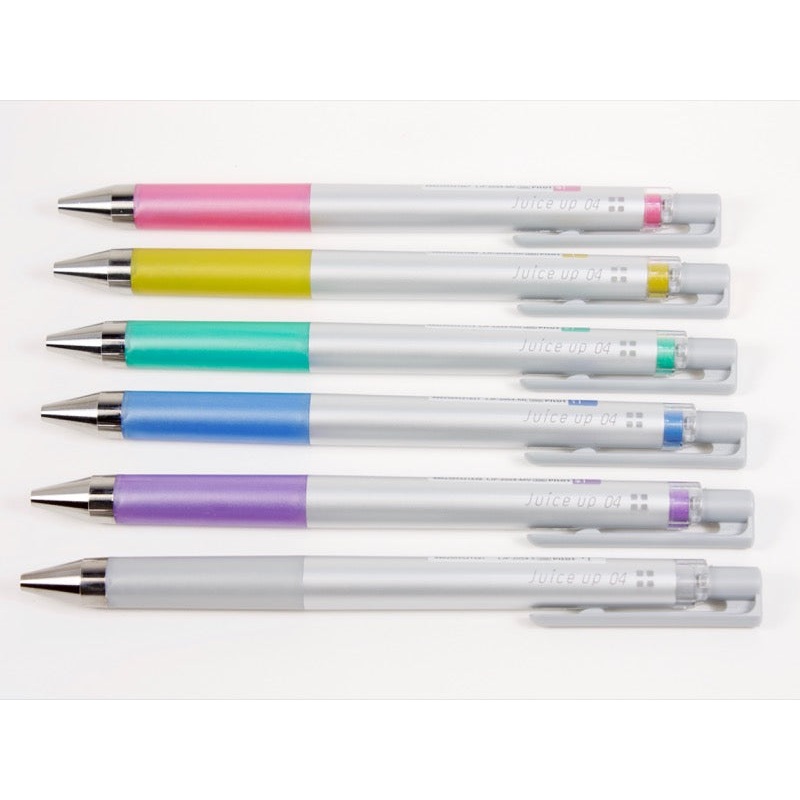 The Pilot Juice Up has the cult favorite needle-nose tip of the Pilot Hi-Tec C in a convenient click-top body. The Juice Up body is weighted more toward the bottom for a smoother writing experience. The grip is also very comfortable. Juice Up ink is a water-based pigment ink that is both water and light resistant. The metallic and pastel Juice Up are available in .4 mm tip size. Metallic colors include: Metallic Pink, Metallic Green, Metallic Blue, Metallic Violet, Gold, and Silver. Pastel colors include: Pastel Pink, Pastel Orange, Pastel Green, Pastel Blue, Pastel Violet, and White. These are the finest-tipped metallic and pastels we’ve come across. Most do not come finer than .5 mm. Pair perfectly with the Pilot Black Notebooks!