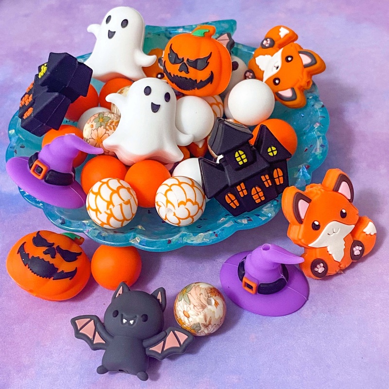 JUMBO HALLOWEEN & AUTUMN SILICONE BEADS 15mm to 32mm PUMPKIN HOUSE HAT BAT FOX +