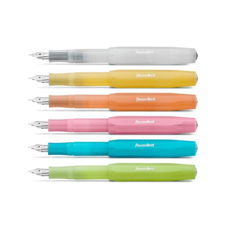 Each pen is made of high-quality plastic, and is compact when capped (4.1 inches long) but very comfortable when posted (5.2 inches long). Thus the Kaweco slogan “Small in the pocket, great in the hand”. The light colors and fresh names emphasize the summer feeling.