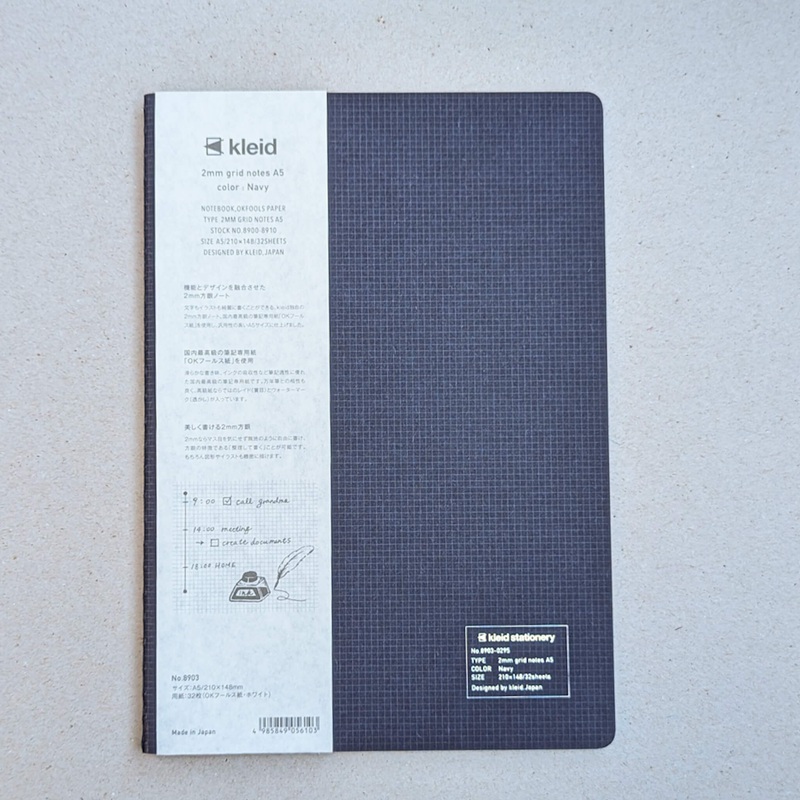This A5 notebook is made with high-quality Japanese "OK Fools" paper and features 64 pages/32 sheets of 2mm white grid paper. Its lay-flat thread binding ensures that each page lies flat when opened, and the A5 size makes it perfect for taking notes on the