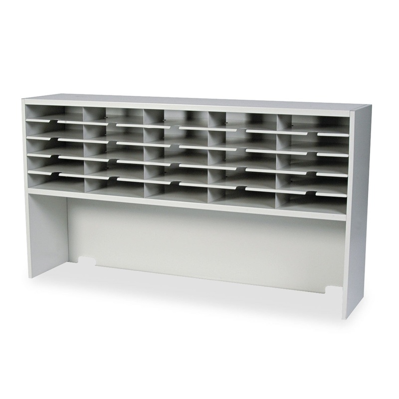 Mailroom sorter features large 11 5/8w x 13 1/4d x 2 5/8h fixed compartments that easily accommodate mail volume. Compartment "thumb cuts" speed mail retrieval. Rugged steel construction stands up to the wear and tear of a busy mailroom.