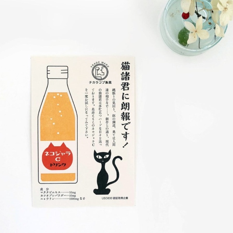 Kyupodo Letterpress Postcard – Black Cat’s Vitamin C Drink