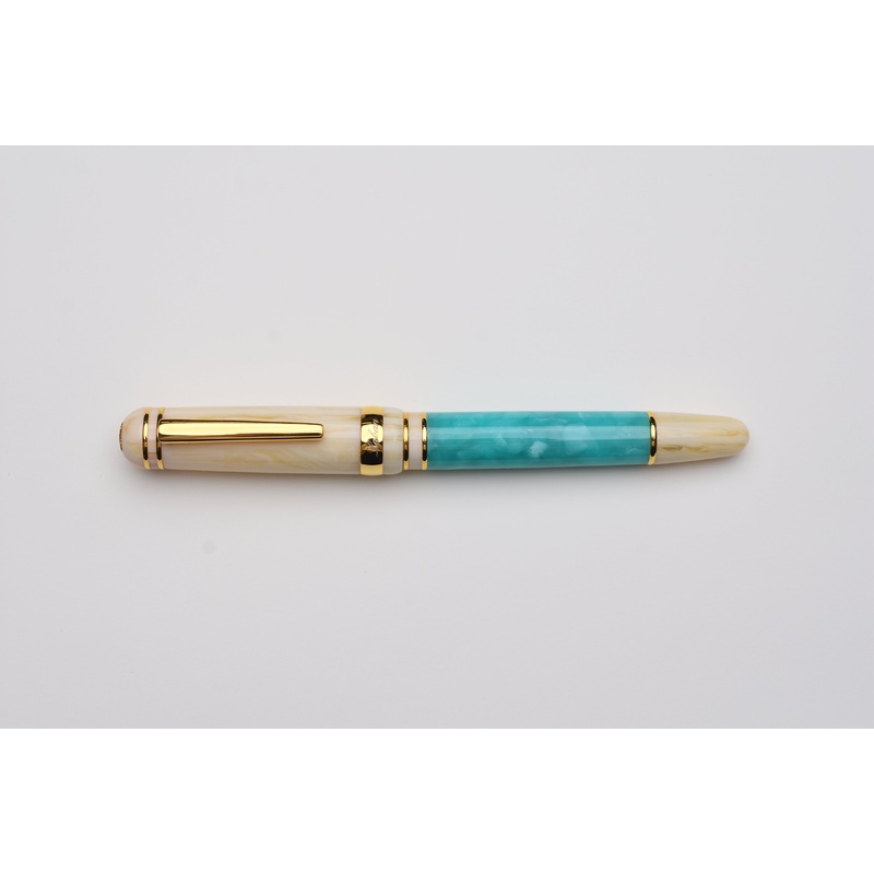 Lagoon is a turquoise lake of paradise, the ultimate tranquility. Life finds a place to rest on the shore, where sunshine turns gentle and waves kiss toes. This marbled blue-green pen hopes to transport you to this place of relaxation.