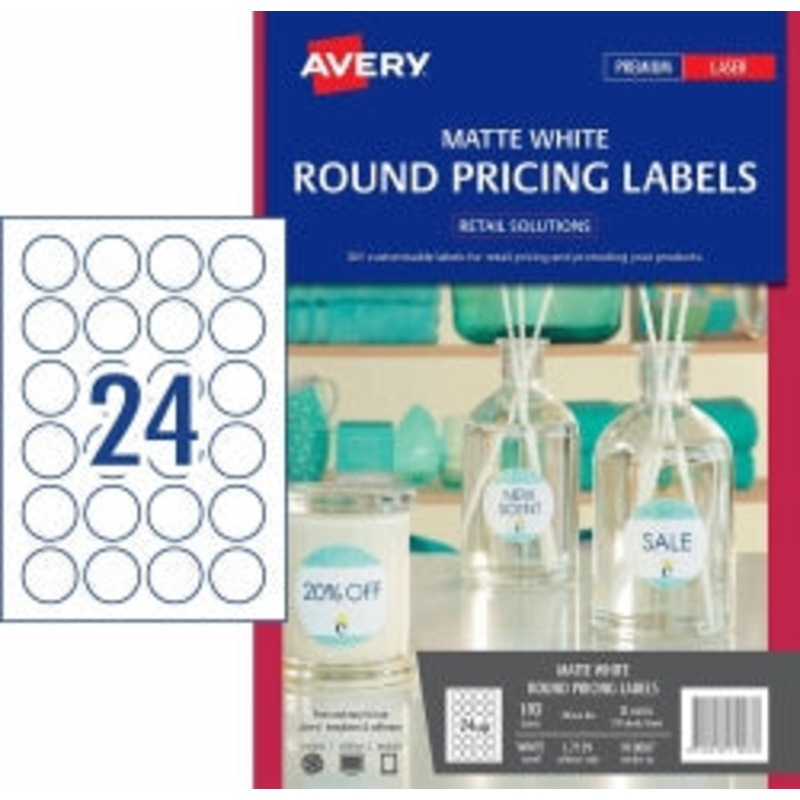 XX5WS887LABELS AVERY LASER L7129 40MM ROUND MATT WHITE 24UP PK8 G24906