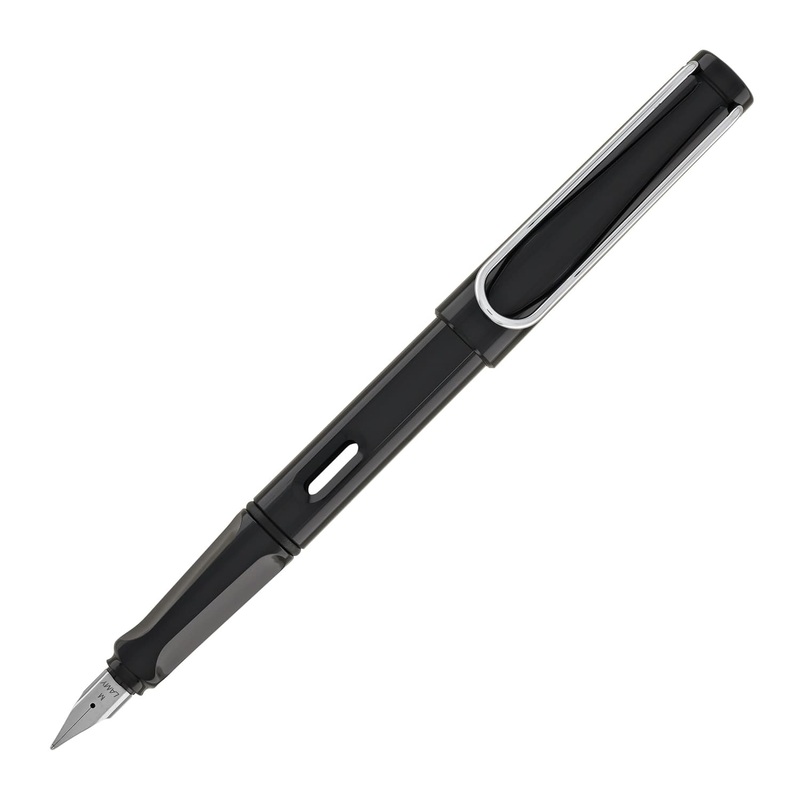 Lamys renowned Safari line is an injection molded from sturdy ABS plastic with an all-around shiny black finish. The signature Safari wire clip is trimmed in chrome with a matching stainless steel nib on the fountain pen.