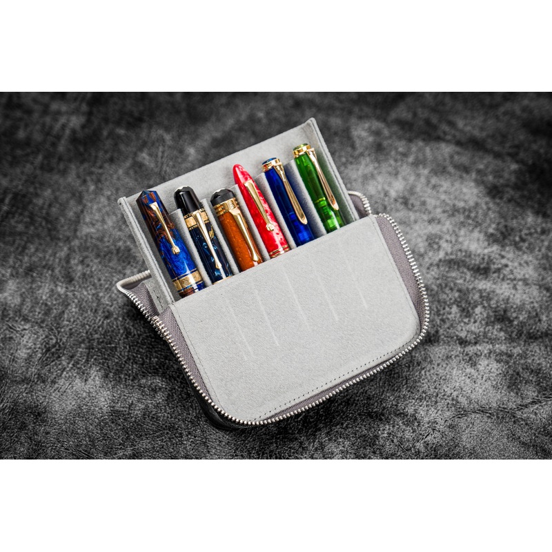 100% Handmade in TurkeyProduct:Handmade Crazy Horse Smoky Leather Zippered Magnum Opus 6 Slots Hard Pen Case with Removable Pen TrayColor/Finish:Crazy Horse Smoky Grey/DistressedDistressed smoky color showing under-tones of the black and rich grey. Ages an