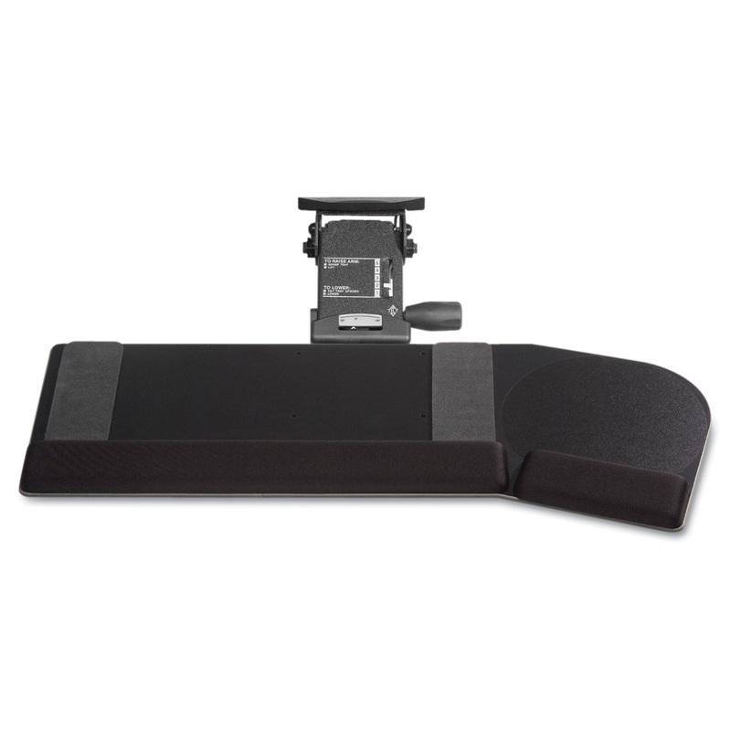 California phenolic keyboard tray with angular design helps mimize overreaching while using a mouse. Leverless Lift-N-Lock arm provides effortless height adjustment. Easy to view tilt dial with soft touch adjustment knob. Viscoflex memory foam wrist suppor