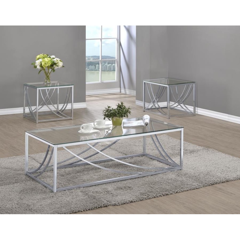 This coffee table set, including a cocktail table and end table, blends sleek modern design with practical functionality. Both pieces feature clear tempered glass tops and electroplated polished chrome frames. The curved metal accents add a contemporary, e