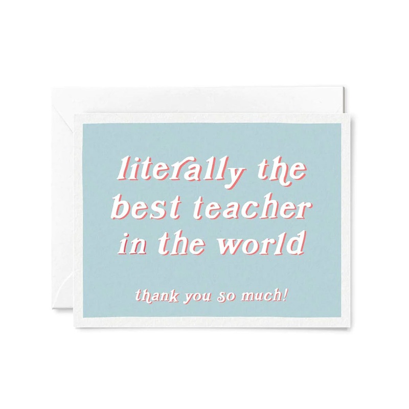 For the teacher who puts up with your kid AND does it with a smile on their face.Blank insideFlat printedSize: A2 folded card, 4 1/4" x 5 1/2"Paper: 110lb felted paperPackaging: Clear plastic sleeveMade in the United States of America