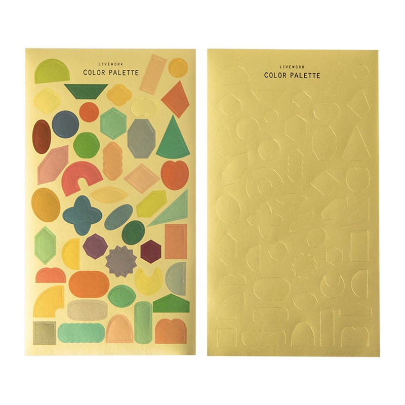 Livework's Color Palette Stickers are the perfect accompaniment for multiple creative projects. The Gold Way Shapes sticker set consists of two sheets of assorted, vibrant stickers, with one sheet featuring coloured stickers and the other plain matte gold.