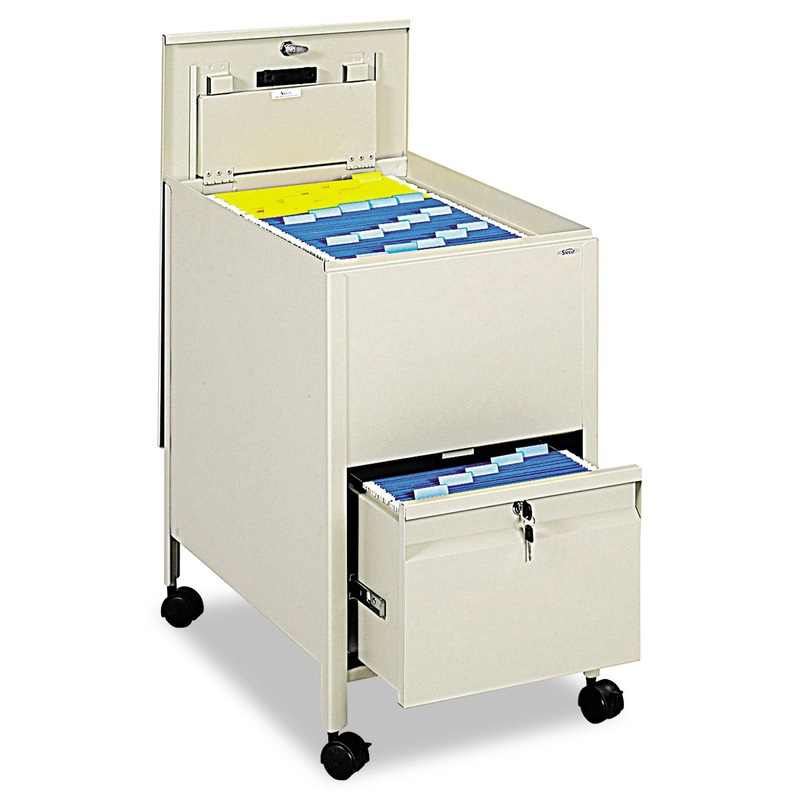 Sturdy steel construction with a textured finish. Tub file on top with slide-away cover keeps dust out while securing files. File drawer below for additional storage. Both compartments are keyed alike. Four swivel casters (two locking) for easy mobility. F