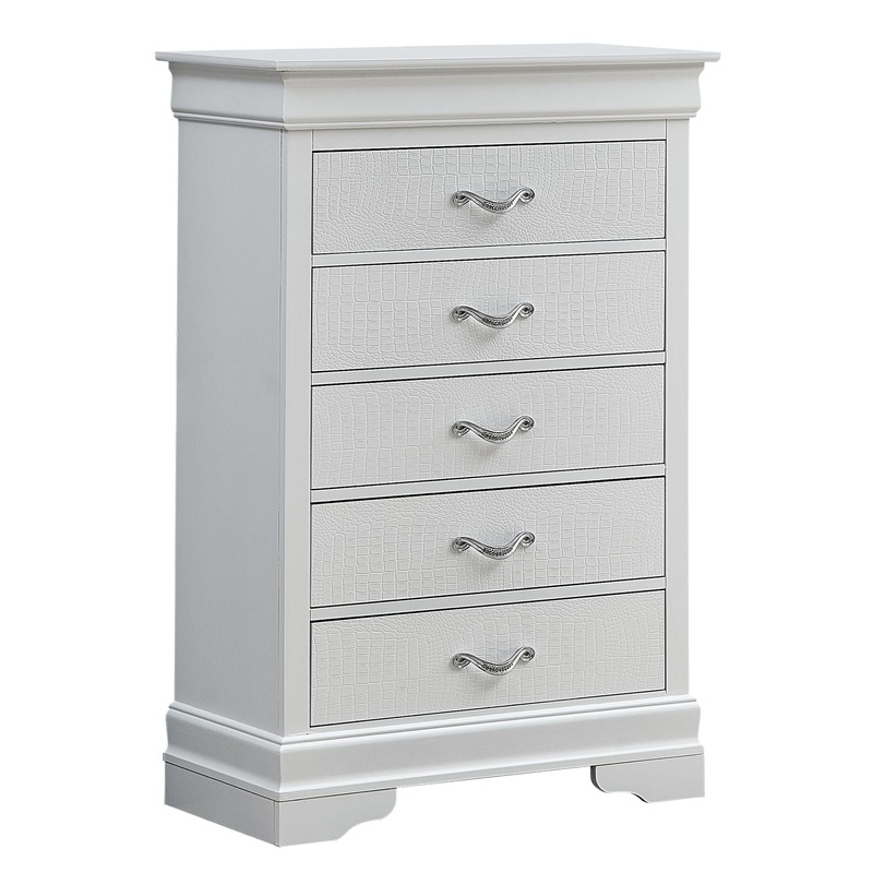 Updated Traditional Design: Features chrome drawer pulls with decorative faux crystals for a modern twist on a classic look. Embossed Textured Finish: Drawer fronts have a textured finish that adds depth and style to the piece. Fully Assembled: Case pieces