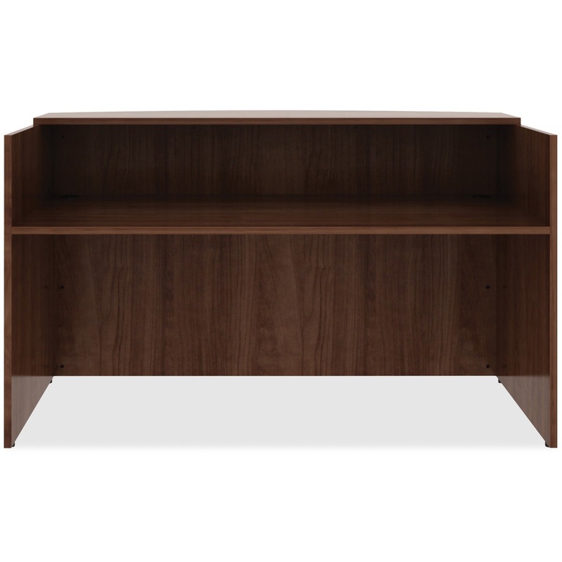 Front reception desk promotes work efficiency while projecting a professional image for greeting visitors. It is part of the Lorell Essentials Series Wood Laminate Furniture with high-quality laminate construction and a contemporary design. High sides surround the desktop on three sides and extend to the floor to provide privacy for confidential documents and details. The built-in counter above the desktop acts as writing support and platform for connecting with customers or patients. Desktop and counter feature 1″ thick laminated tops for durability.