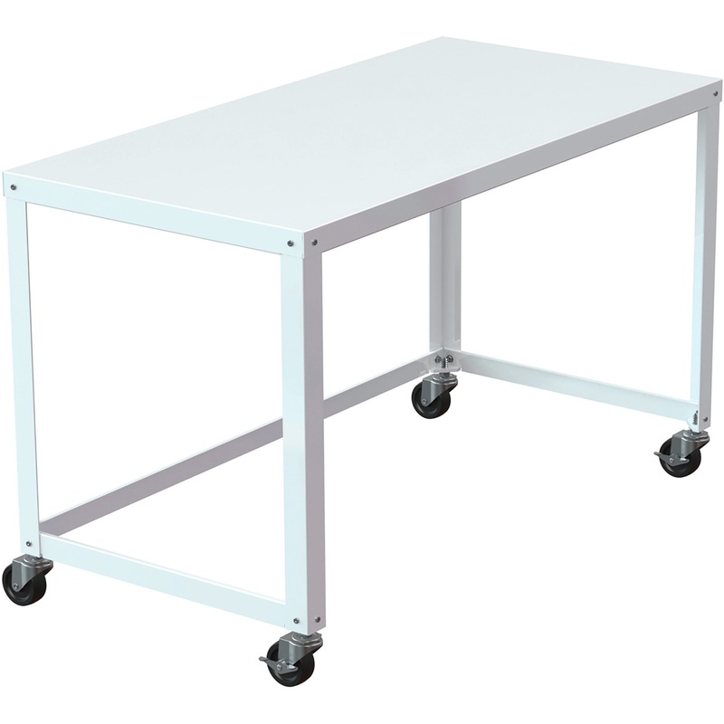 Spacious desktop offers plenty of work space for any work style. The minimalist style makes it ideal for a personal workstation or a collaborative workplace. Steel frame construction with support cross bars offers added strength. Four convenient rolling ca