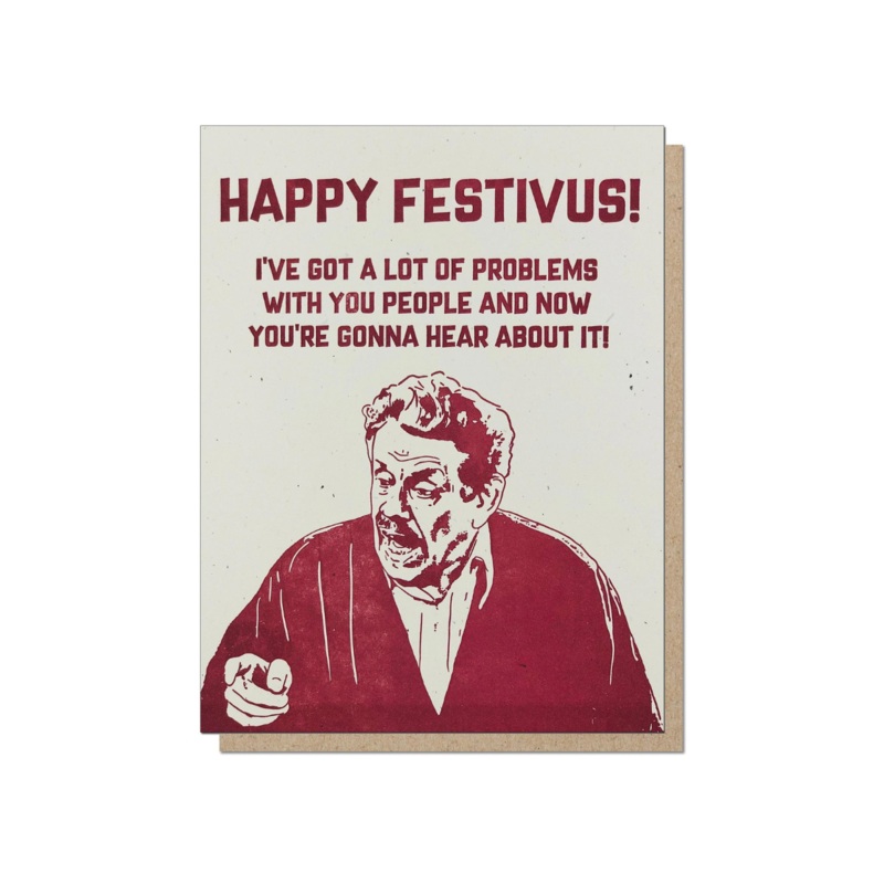 "Happy Festivus! Ive got a lot of problems with you people and now youre gonna hear about it!Size: A2 (5.5 x 4.25")letterpress printed on french paper co. Card stockPackaged with recycled kraft paper envelope.