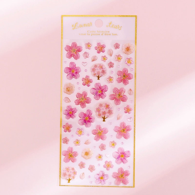 Let the magic of spring bloom with the Lunas Tears Puffy Sakura Stickers! These soft, puffy cherry blossoms shimmer with golden details, adding a dreamy touch to your crafts, journals, and more. Like petals kissed by sunlight, they bring the fleeting charm of sakura season to life.