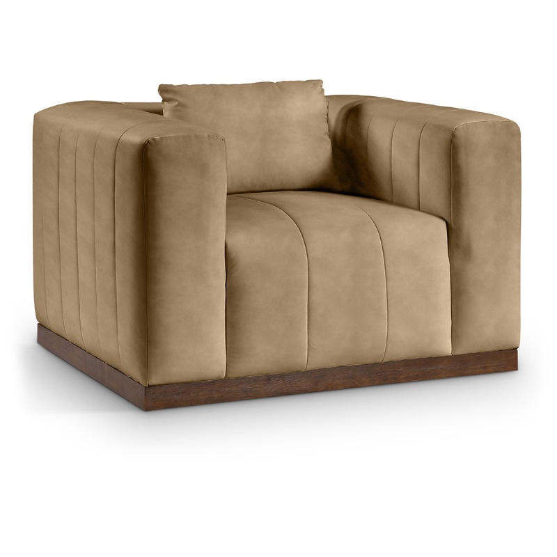 A minimalist masterpiece, the Mallina tan vegan leather accent chair combines form and function for a modern and stylish look. Its classic design and rich leather upholstery make it a sophisticated statement piece that will never go out of style. The clean