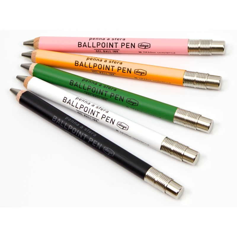 The Mark's Inc. Days Wood Gel Pen is a needle-nose quick-dry gel ink pen in .5mm black ink. The barrel of this pen is wooden like a classic school days pencil..5 mm black gel inkYour choice of body color: Pink, Red, Orange, Green, Blue, White, Natural, or