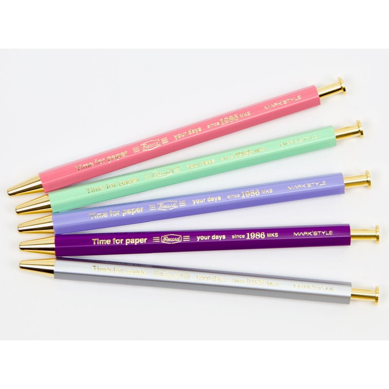 Mark's Inc. Time for PaperGel Pen has an elegant shaft reminiscent of a regular wooden pencil, with the functionality of a gel pen. Pen holds a .5mm black gel Ohto Refill, and is refillable. This pen has a needle-nose tip. .5mm black gel inkRefillableShort