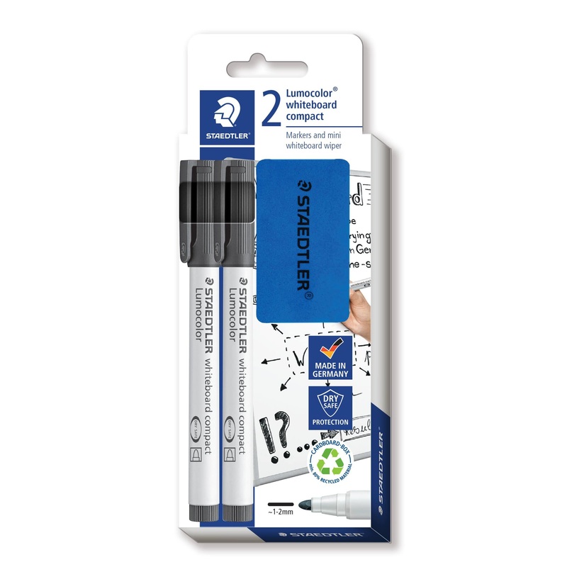 7W5184W5MARKER STAEDTLER LUMOCOLOR WHITEBOARD COMPACT BULLET/P PLUS ERASER BLK PK2 G93556