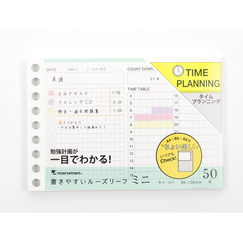 These Time Planningrefills fit the Mini Session Binder and provide 50sheets of organized time planningpaper perfect for study planning. The Maruman Mini Session binder is a handy "one-hand" size perfect for carrying all the essential points! You can also u