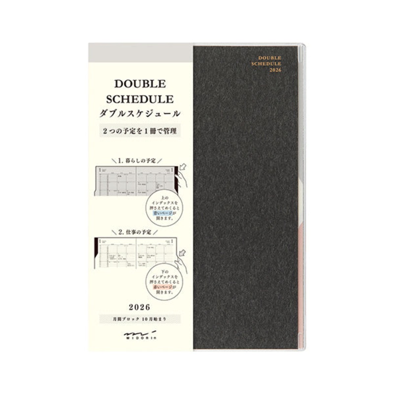 The Midori Double Schedule Diary allows you to manage two different schedules, such as “work” and “private life,” or “self” and “family,” in a single planner. You have two monthly calendars for each month.