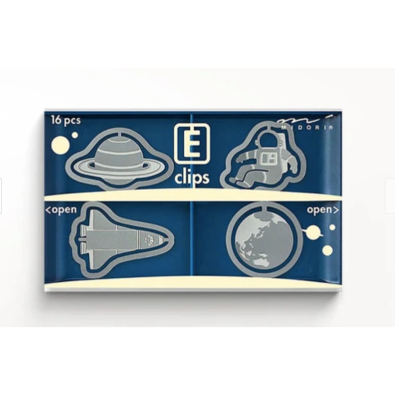Organize your papers with a cosmic touch using the Midori Etching Clips in Space. From stars to rockets, each stainless-steel clip is etched with one of four galactic designs. The set includes 16 clips in a matching case, each clip able to hold about 10 sh