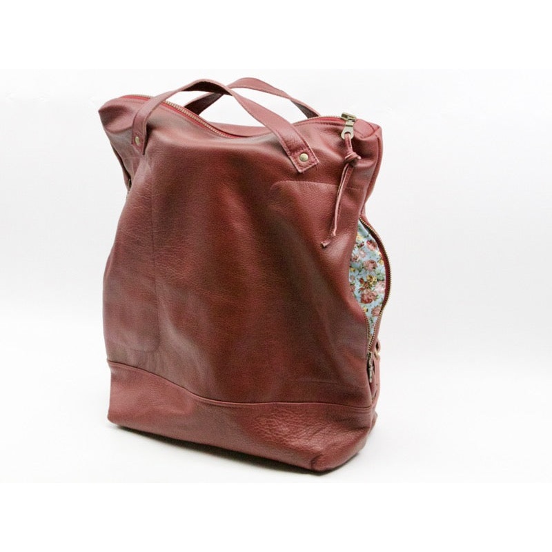 - Soft burgundy cow leather, assorted floral cotton lining (current stock has the floral with black background), YKK exterior zippers