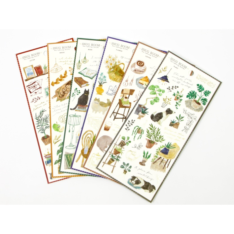 Mind Wave Japan Snug Roomwashi stickersare perfect for creating those Insta worthy journaling pages. Each sheet of washi stickers includes a cozy theme including a featured pet and some gold accents.Choose from the following themes:CoffeePlantsFlowersBooks