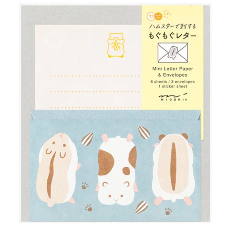 This Japanese letter set features a cute hamster illustrations on 6 sheets of paper. It comes with 3 envelopes and a sticker sheet too. Use the sheets to write notes to your friends to let them know you're thinking of them! Details: 6 mini letter paper she