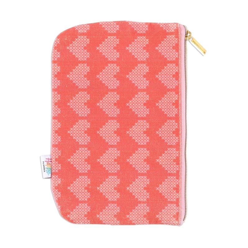 Keep all your planning necessities on hand! This canvas pouch features a cozy sweater-like heart pattern with pink hearts on a red background. The back has a contrasting pattern. The pouch has a red band that wraps around your Happy Planner cover. The zip