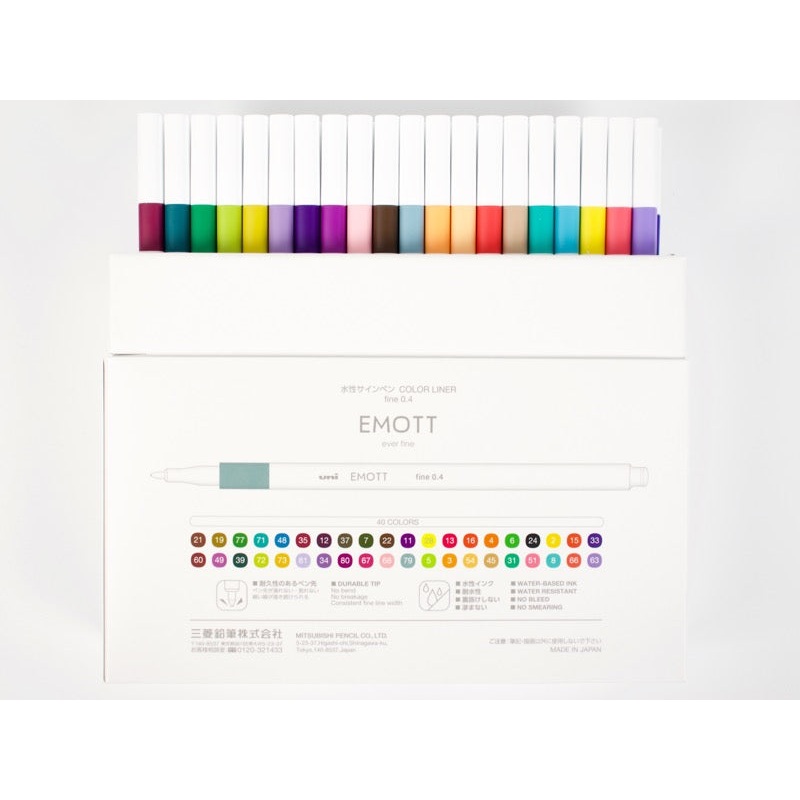 Mitsubishi brings you the latest amazing color fine liner, the Emott Ever Fine. Available in a complete 40 color set. The Mitsubishi Emott Ever Fine is a durable plastic tip fine liner in .4mm tip size. Emott ink is water-based and water-resistant. You wil