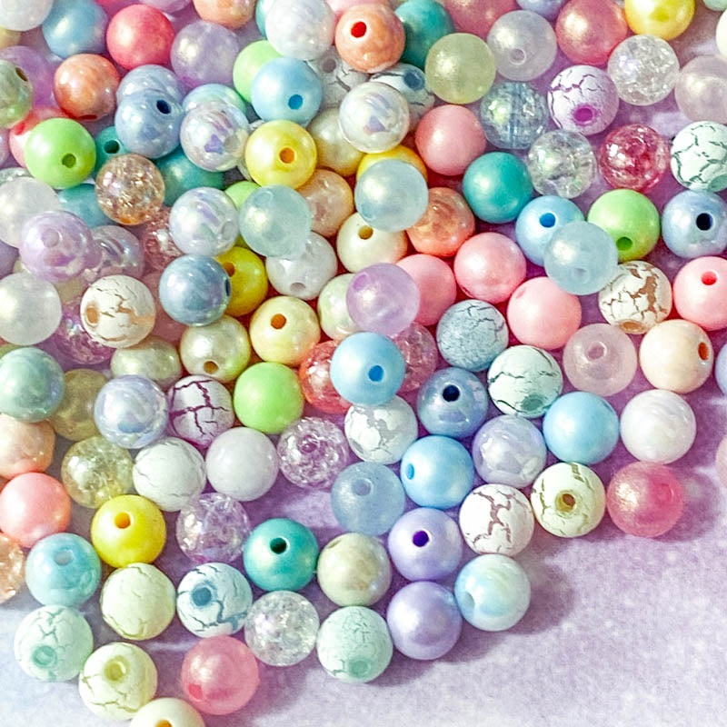 You will receive a set of 30 round acrylic beads. Some with iridescent coating, some pearlescent, some crackle glaze and some plain. Beads measure 8mm in diameter.