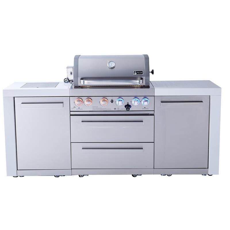 The Mont Alpi 400 6-burner Island gas grill is a prefabricated all 304 (marine grade) stainless steel gas grill with modern white waterfall granite side cabinets. It has a large 6 burner (78,000 BTU) grill with additional infrared side burner and infrared