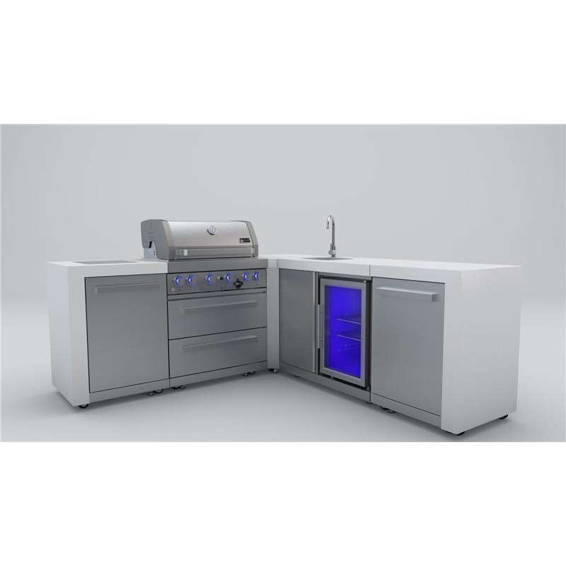 The Mont Alpi 400 6-burner Island gas grill is a prefabricated all 304 (marine grade) stainless steel gas grill with modern white waterfall granite side cabinets and a 90 degree corner carts to create a beautiful “L” shape. This island comes with a beverage center complete with an outdoor rated fridge and stainless steel sink that can be permantently plumbed or hooked up to a garden hose. It has a large 6 burner (78,000 BTU) grill with additional infrared side burner and infrared rear burner. It comes fitted with halogen lights in the cooking zone to make grilling in the dark a lot easier. The knobs are fitted with on/off color changing LED lights. It has 8mm 304 stainless steel rod cooking grates and 304 heavy duty tubular high-efficiency burners. With very little assembly, you will be grilling in no time. The caster wheels allow it to be moved around. Once you have found the perfect spot the wheel levellers will ensure your grill is stable. A heavy duty electric rotisserie kit, chopp