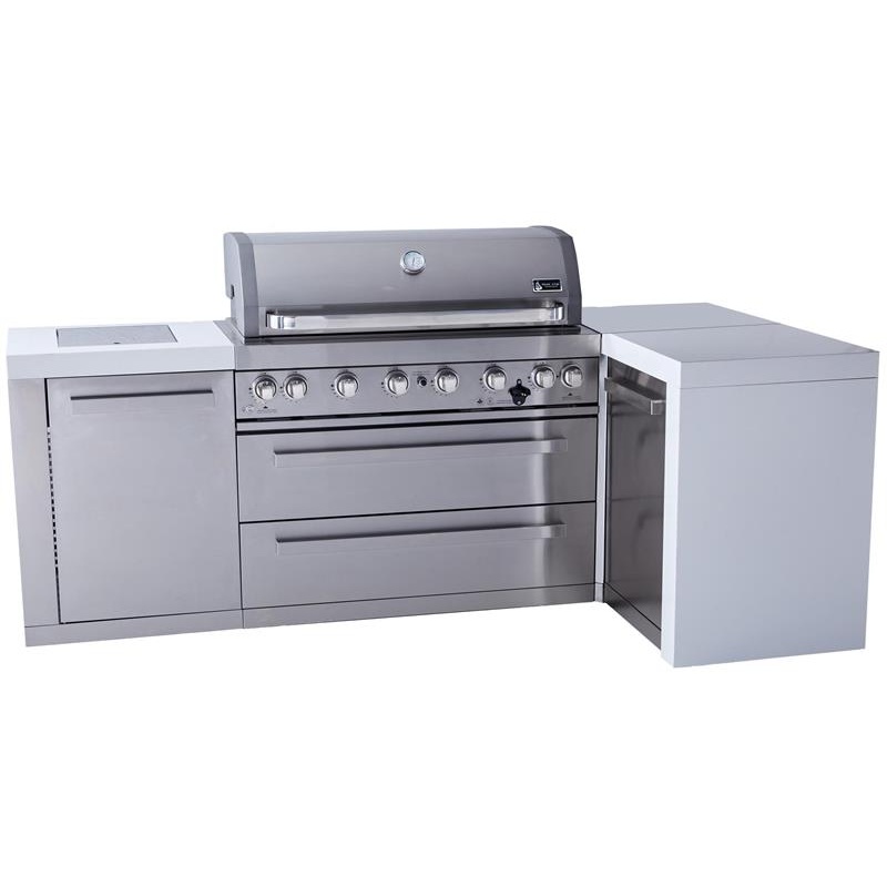 The Mont Alpi 805 8-burner Island gas grill is a prefabricated all 304 (marine grade) stainless steel gas grill with modern white waterfall granite side cabinets and a 90 degree corner unit to create a beautiful “L” shaped design. It has a large 6 burner (115,000 BTU) grill with additional infrared rear burner. It comes fitted with halogen lights in the cooking zone to make grilling in the dark a lot easier. There are also on/off color changing LED lights on each control knob. It has 8mm 304 stainless steel cooking grates with heavy duty tubular high-efficiency burners. With very little assembly, you will be grilling in no time. The caster wheels allow it to be moved around. Once you have found the perfect spot the wheel levellers will ensure your grill is stable. A heavy duty electric rotisserie kit, chopping board and heavy duty all weather cover are all included. There is also an infrared side burner with adjustable heights for those times you want to really enjoy a good steak or he