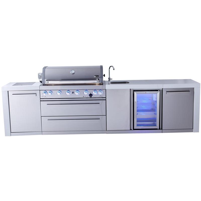 The Mont Alpi 805 8-burner Islandr gas grill is a prefabricated all 304 (marine grade) stainless steel gas grill with modern white waterfall granite side cabinets a beverage center included. This unit has a lockable, outdoor rated fridge with stylish blue LED lights. It also has a stainless steel sink and faucet that can be permanently plumbed or hooked up to a garnden hose. It has a large 6 burner (115,000 BTU) grill with additional infrared rear burner. It comes fitted with halogen lights in the cooking zone to make grilling in the dark a lot easier. There are also on/off color changing LED lights on each control knob. It has 8mm 304 stainless steel cooking grates with heavy duty tubular high-efficiency burners. With very little assembly, you will be grilling in no time. The caster wheels allow it to be moved around. Once you have found the perfect spot the wheel levellers will ensure your grill is stable. A heavy duty electric rotisserie kit, chopping board and heavy duty all weathe
